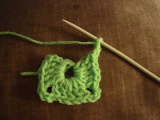 Cambio de color , subo nuevamente 3 puntos. y tejo grupos de a 3 varetas dobles, pero a la 4ta tejo la esquina,